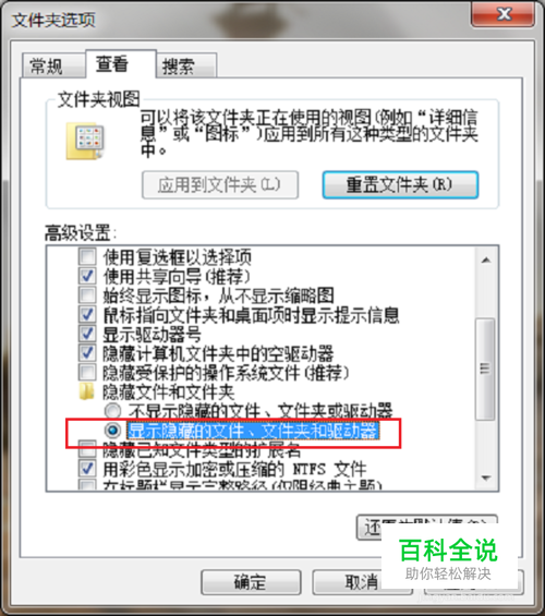 第二步点击确定之后,在查看中勾选“显示隐藏的文件、文件夹和驱动器”,点击确定,如下图所示: