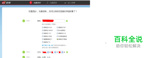 立即注册后自动跳转到资料完善界面,输入昵称(可以选择所推荐的昵称,也可以自己取昵称),输入生日、性别、所在地,填写没问题后,点进入兴趣推荐