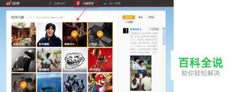 点进入兴趣推荐后自动跳转到兴趣推荐界面,然后选择你所感兴趣相关用户,最后点进入微博按钮