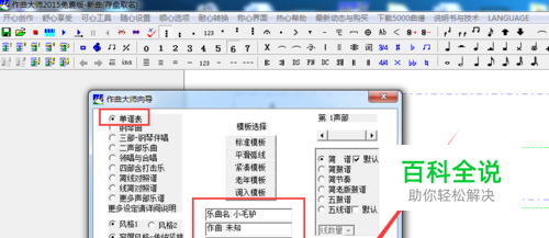 选择谱表类型,输入乐曲名和作者名。我在这里以制作《小毛驴》简谱为例进行解说。打开程序后,弹出一个作曲大师向导页面,选择单谱表,输入乐曲名和作者后,单击确定。