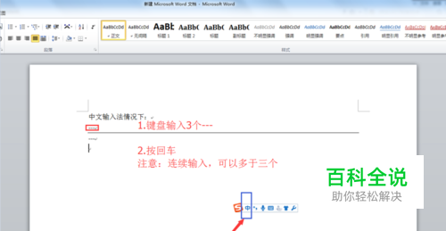 中文输入法情况下,键盘连续输入三个(三个以上)“-”,回车即得一条直线(单行线)。如果不想要输入直线,只想输入三个-,则按一次删除键backspace,或点击前边的警示符号取消输入。