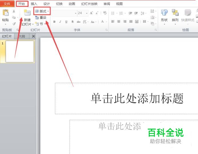 然后我们需要在左上角找到“开始”一栏,并在“开始”栏下面找到“版式”,点击即可。
