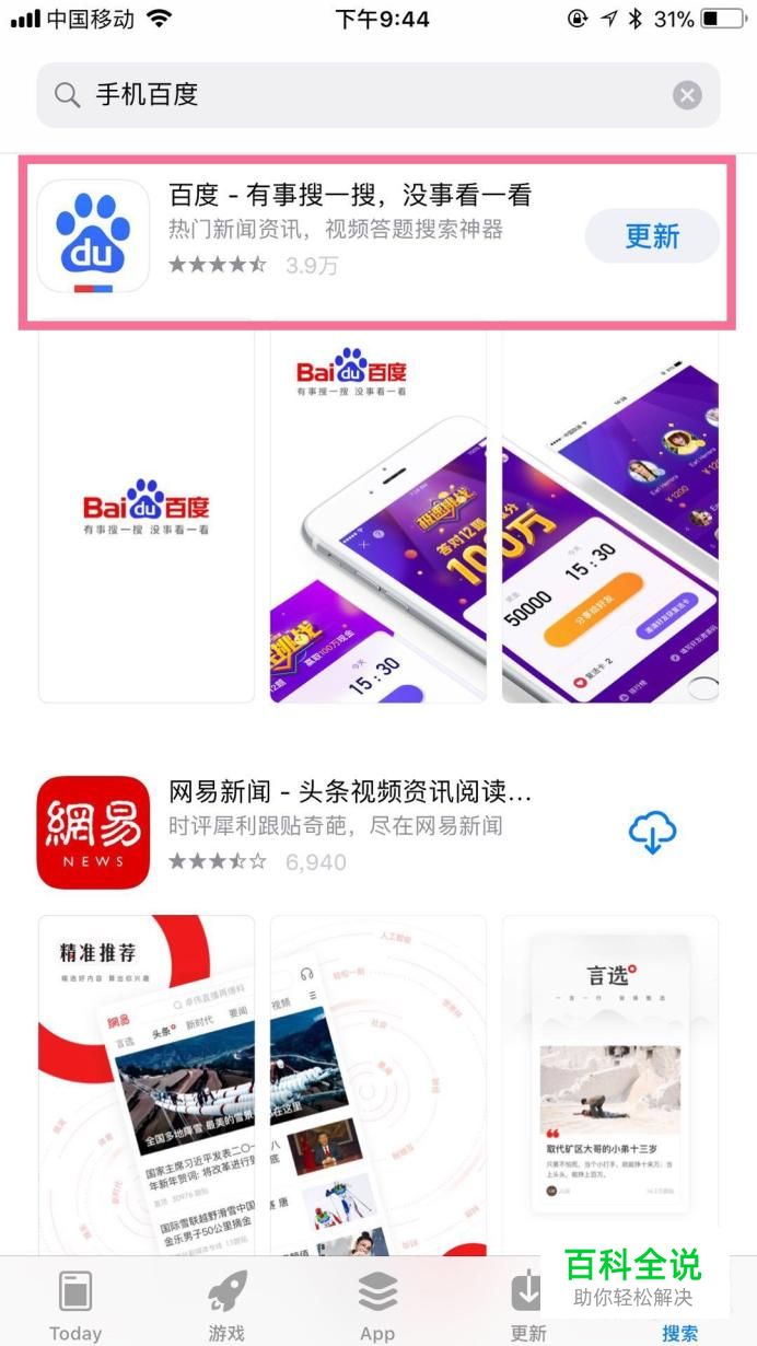 首先在我们的苹果商店或者是应用商城,找到百度app并点击更新到最新版本,如下图所示。