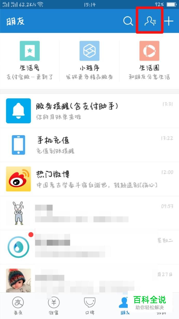 进入支付宝之后,点击支付宝的“朋友”界面,然后点击右上角小编框的按钮,去看一下自己的好友吧。小编就随机选一个好友做示范吧。