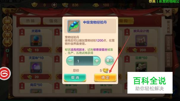 当游戏页面弹出“中级宠物经验丹”对话框后,点击对话框中的“确定”按键,这样玩家就能够通过花费5个绑定的元宝获得1颗中级宠物经验丹了。