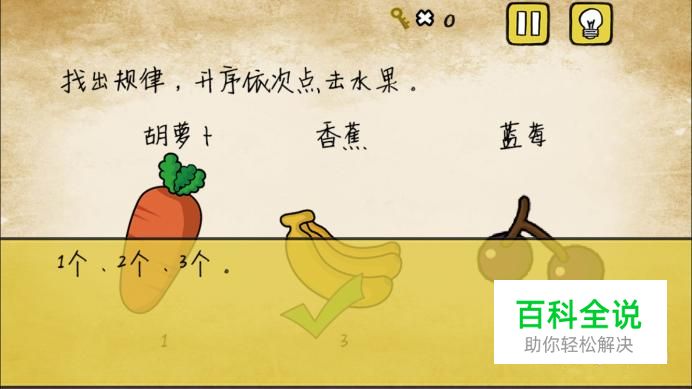 第十七关,依次点击水果,这里是看的数量,所以先点击胡萝卜,然后点击蓝莓,最后点击香蕉。