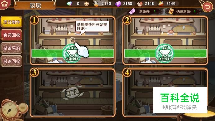 进入厨房界面,在左侧选择“烹饪制作”,进入后即可看到点亮的位置,未解锁的不可使用,点击“点击烹饪”进行烹饪界面。