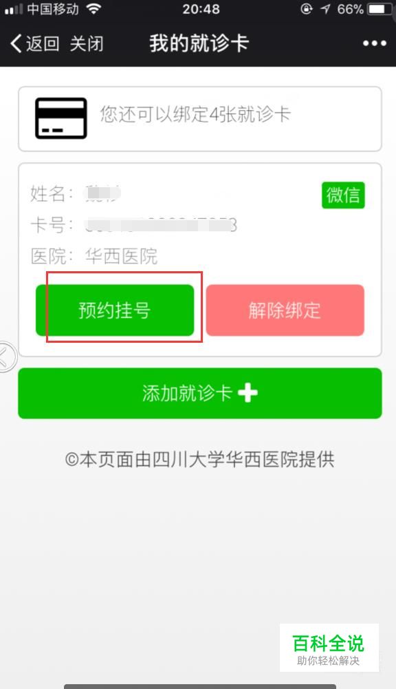 手动输入您的姓名、手机号码、身份证号码以及就诊卡号,输入完毕后点击“确定就诊卡”即可完成绑定。