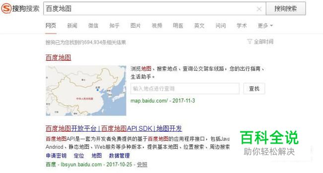 搜狗搜索百度地图后进入到百度地图的官方网站。点击最下方的地图开放平台。