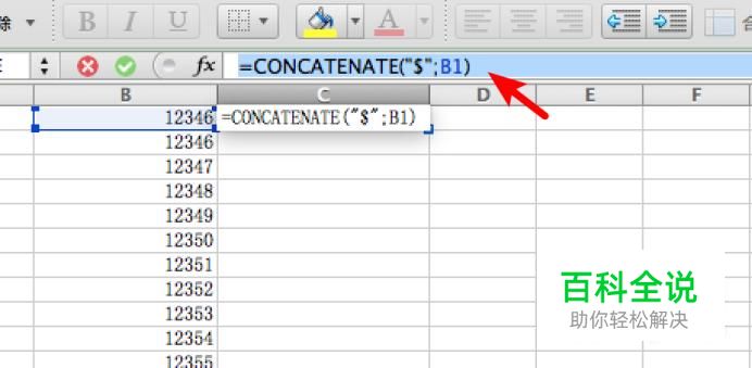 选中C1单元格,在上方的公式栏输入 =CONCATENATE("$";B1)