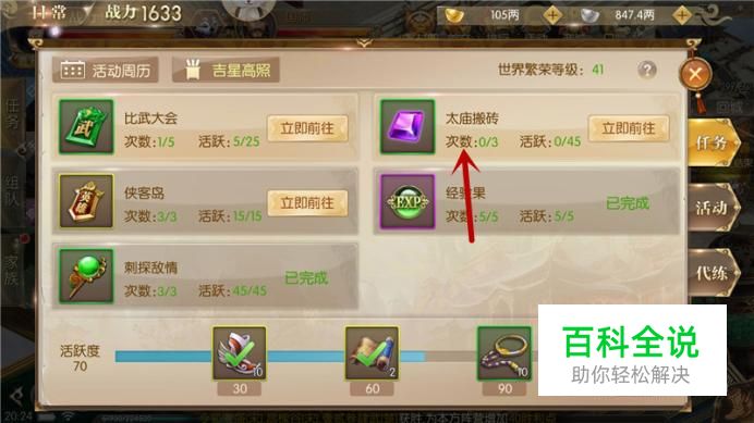 进入活动界面,点击“太庙搬砖”立即前往,每日可参与3次,完成后获得45点活跃。