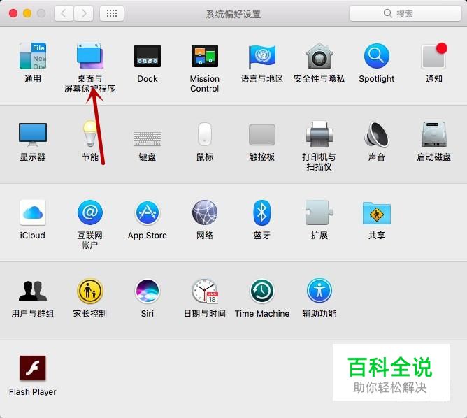 进入系统偏好设置界面,点击“桌面与屏幕保护程序”