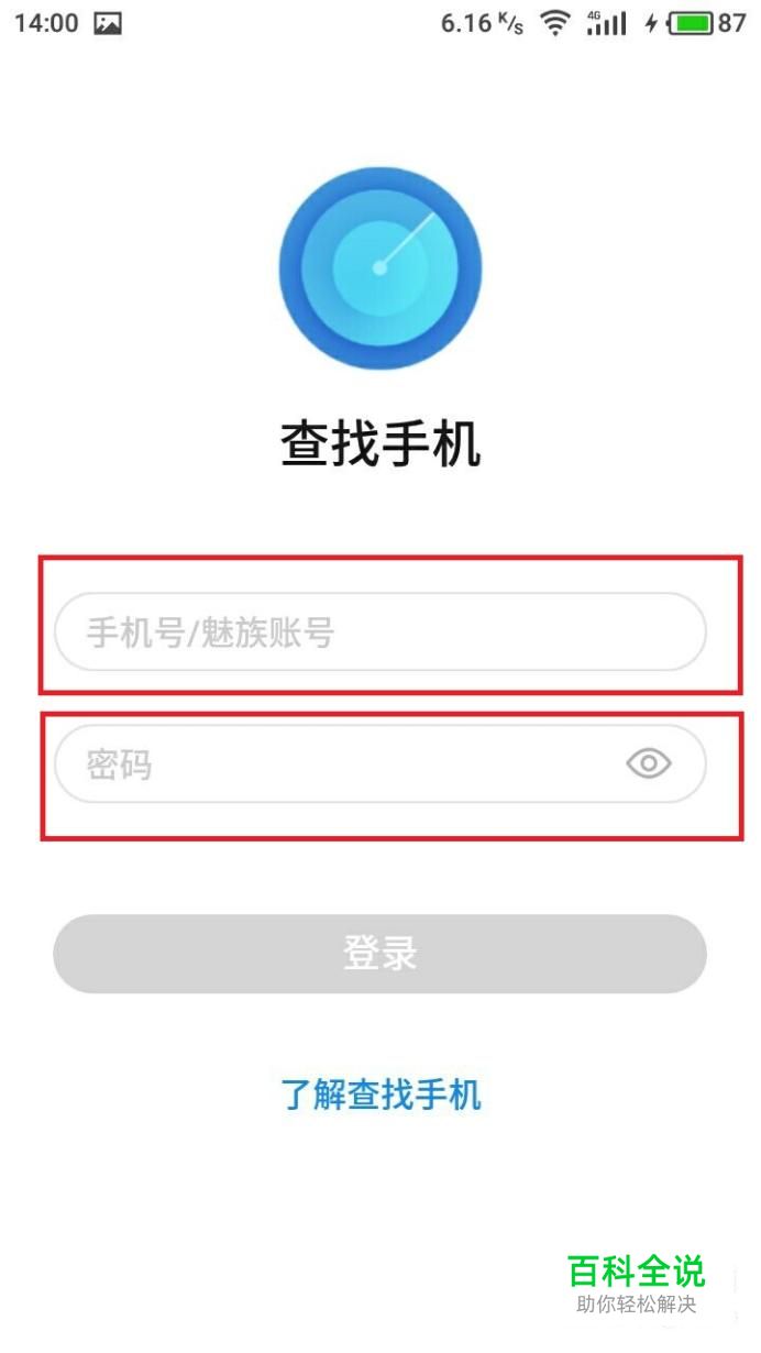 打开“查找手机”应用后,我们会看到有个登录界面,在界面中输入你丢失手机的Flyme账号密码,注意是丢失手机的账号和密码。输入后点击登录并进入界面。