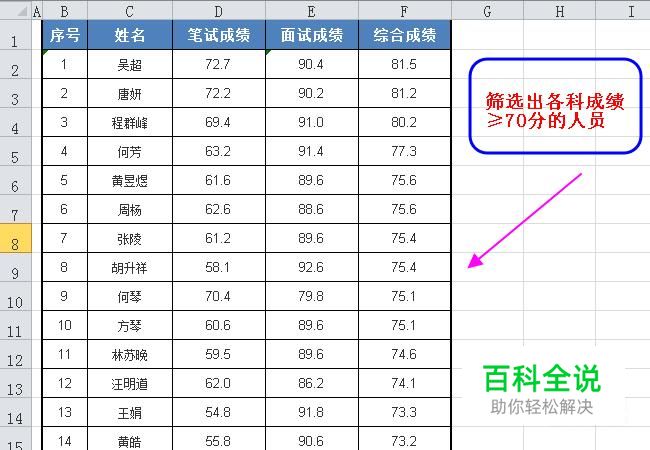 打开例表,假设我们本次要筛选出各科成绩均≥70分的人员。
