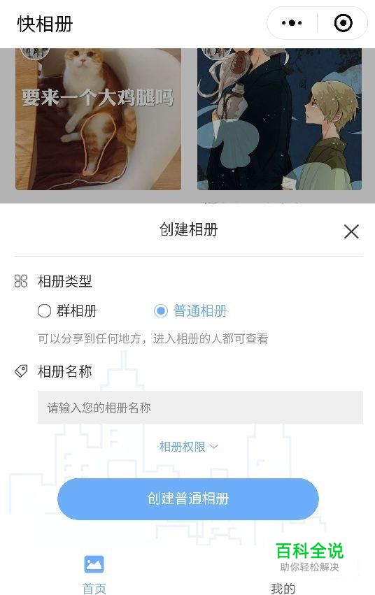 打开【快相册】小程序,点击创建相册按钮可以选择你创建的相册类型,是群相册还是普通相册,这两个的区别就是群相册需要先选择群才能创建成功,而且群相册中的小视频只能群内人员查看。
