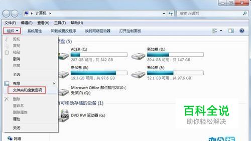 点击左面计算机图标,进入我的电脑界面后,鼠标移动到左侧菜单栏,点击组织,在下拉菜单中选择文件夹和搜索选项。