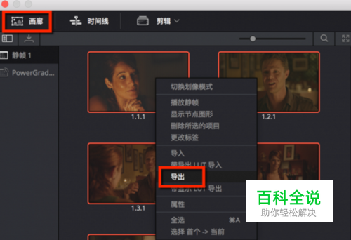 达芬奇调色导出预设时,选中设置所在的镜头,然后截取静帧,在画廊里面导出画面即可。