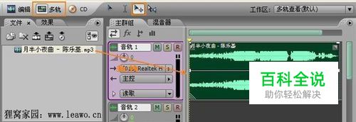 音乐文件被导入进来了,那么接下来的工作当然是对音乐文件进行一些增大声音的操作啦。点击上面的多轨按钮切换到多轨编辑模式,然后用鼠标把文件拖拽到音轨1轨道上。