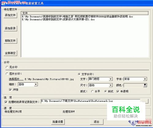 一切OK之后,就可点击“批量设置”进行处理了。整个处理过程所花费的时间依文档容量的大小而定。如果你是想取消原有文档的水印,那么可在添加文件后,单选“无水印”,最后执行批量处理即可。