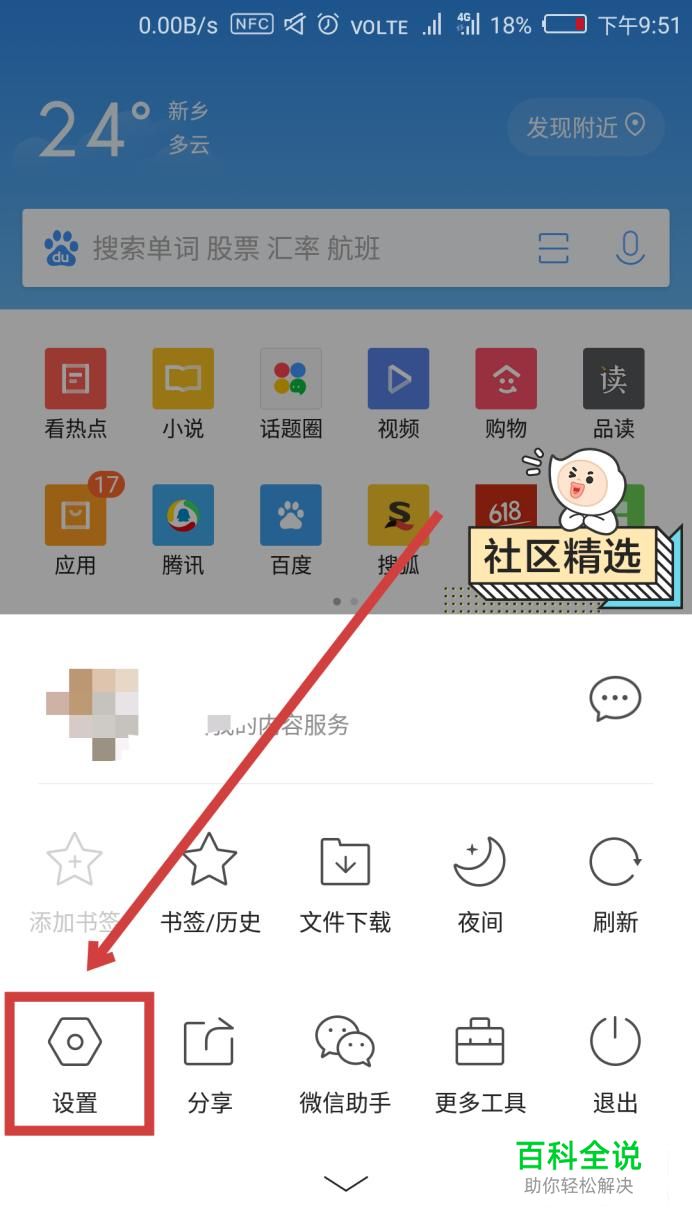 然后在底部弹出的选项卡中找到“设置”,点击进入。