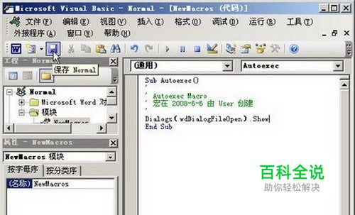 第2步,在打开的VBA代码窗口中的Sub Autoexec()与End Sub两行语句之间输入以下内容: Dialogs(wdDialogFileOpen).Show 并单击“保存”按钮保存程序,如图2008060602所示。 图2008060602输入宏VBA代码