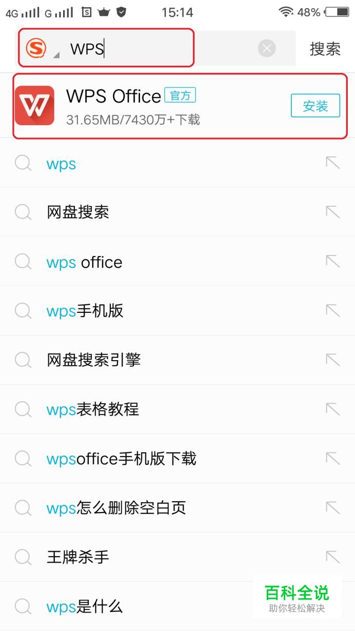 首先,我们需要在手机中安装WPS软件,可以用手机浏览器搜索的方式找到正确的软件资源,并下载下来,完成安装。