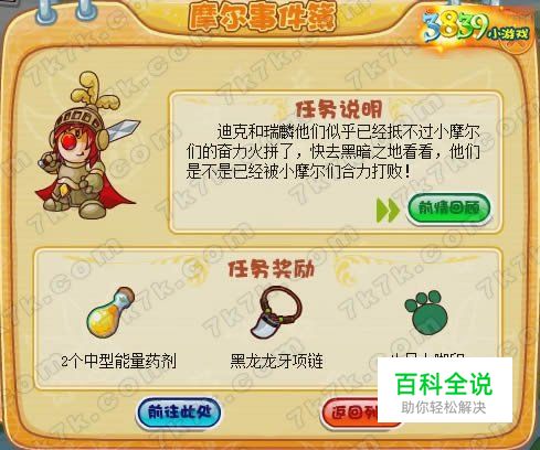 迪克和瑞麟他们似乎已经抵不过小摩尔们奋力火拼了,大家快去暗黑之地看看,他们是不是已经被小摩尔们合力打败了。完成摩尔庄园永远的塞拉王子任务,就可以得到2个中型能量药剂,黑龙的牙齿项链和八月小脚印。