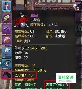 我们想提高他们只能通过装备打磨系统中的精工和琢磨。精工一个是增加属性的主属性,一个则是增加装备能力百分比,随着他们2个的等级提升,你的匠心值也会提升。比如下图中的装备,匠心值,其中精工等级为14,琢磨等级为11。