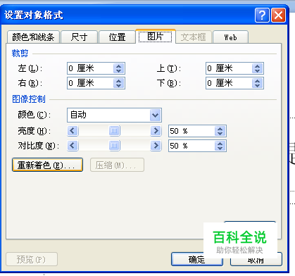 在弹出的对话框选“图片”,点“重新着色…”按纽,出现“图片重新着色”对话框。