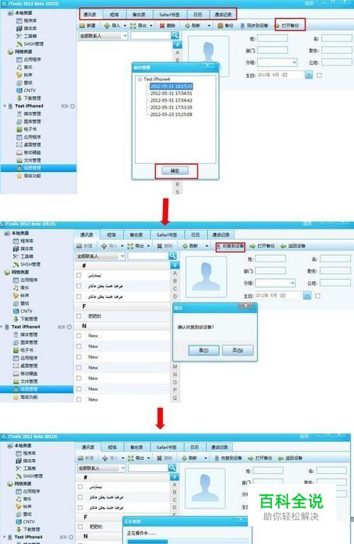 对通讯录,短信等进行恢复可以从iTools信息管理中,打开备份信息,找到最近备份的资料信息并恢复到设备即可找回资料。