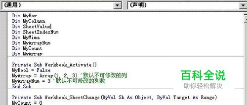 上述代码实现的功能是:无论您当前的工作薄有多少个工作表,无论您的工作表中有多少条数据,如果要修改被限制的列的数据,则需要输入密码,密码正确则可以修改,密码错误则无法修改!在不能修改数据的前提下,不弹出任何提示信息,仅将修改后的数据恢复到原来没有修改的状态,实现禁止修改列数据的目的!