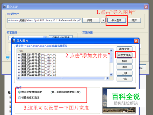 在“输入PDF”界面,点击“导入图片”,点击“添加文件夹”按钮,选择整理好的图片的文件夹,这时界面就会出现导入的图片的路径,可以检查下,图片顺序对不对