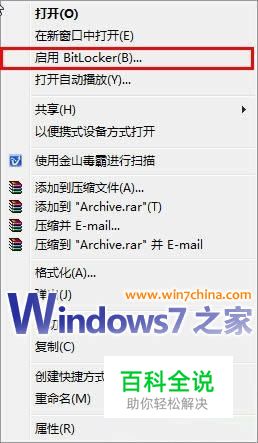 在Vista系统中就已经具备了BitLocker安全功能,而Windows7的BitLocker功能则更强大些,不需要用户进行修改组策略等繁杂的设置,只要以管理员身份登录到Windows7系统就可以使用。插好U盘后,在“计算机”中右键点击该U盘,在弹出菜单中选择“启用BitLocker”。