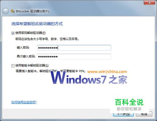 此时会弹出一个“BitLocker驱动器加密”向导,根据需要选择解锁驱动器的方式,小编建议大家选择“使用密码解锁驱动器”。连续输入两次密码后(密码最少为8位字符),点击“下一步”。