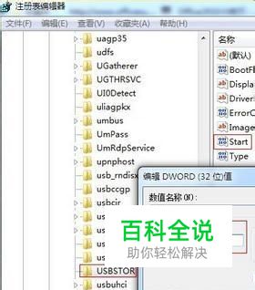 展开定位到HKEY_LOCAL_MACHINE\SYSTEM\CurrentControlSet\services \USBSTOR,在右侧窗口中找到并双击“Start”,将其默认值“3”修改为“4”确定即可。