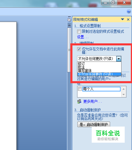 选择“审阅”,然后再选择右边的“保护文档”按钮,在下拉菜单中选择“限制格式和编辑”