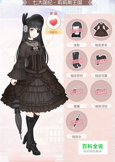 暗夜萝莉套装一览 奇迹暖暖暗夜萝莉套装一共有7件,全部收集齐之后可以得到本套服装的奖励:35体力。