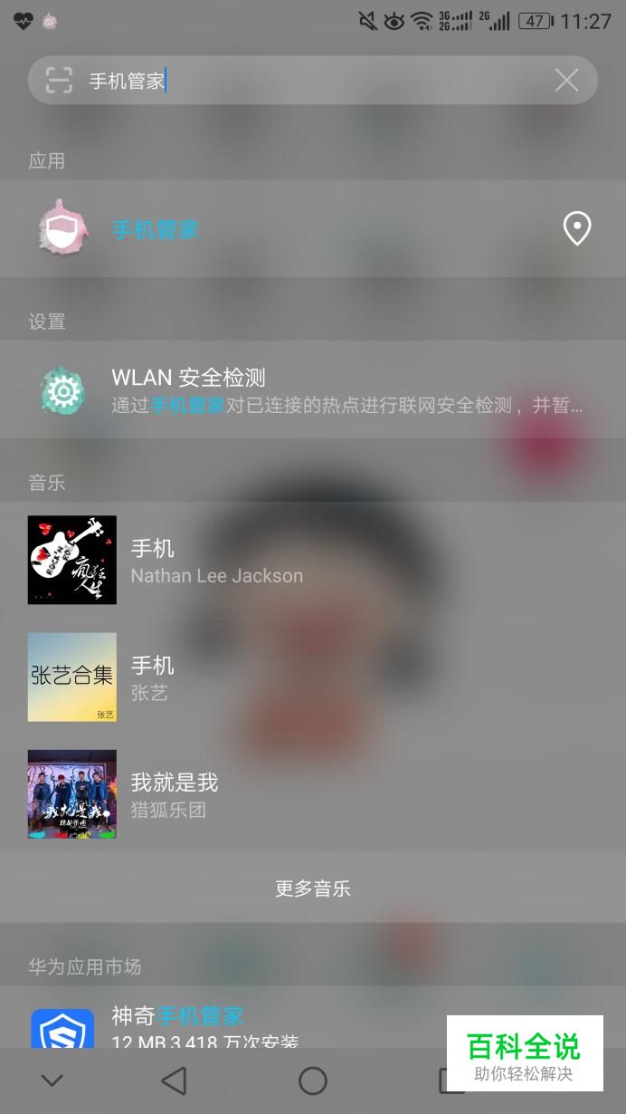 打开华为手机,下拉界面,进入搜索栏,点击搜索华为自带的“手机管家”软件。