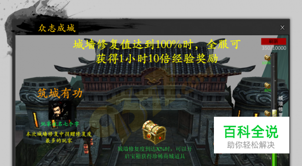 《问剑》众志成城活动的玩法: 1、开启时间:全天开放,每天24点刷新捐献次数; 等级限制:无限制; 活动场景:受损的城墙,通过主界面右上角按钮打开活动界面。 2、玩家通过众志成城活动界面捐献劳力,木材和石料增加城墙的修复值,每次捐献劳力都会获得与等级相对应的经验、金钱、真气奖励。前十次捐献木材和石料才可以获得奖励,石料和木材可以通过击杀活动怪物和副本怪物获得。每当城墙修复值提高20%,所有开启众志成城权限的玩家都有1次开启宝箱的机会,宝箱一定几率出现商城道具。当城墙修复值到达100%时,全服所有玩家获得10倍经验1小时,3小时后城墙修复度重新归零。 3、捐献木材劳力石料玩可以通过平时任务、副本、打boss等等获得。