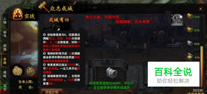 《问剑》是目前国内唯一一款真正的纯3D即时战斗网页游戏,在页游中首创内功、心法与招式结合的战斗方式,让玩家在游戏中行侠仗义、抵御外辱,同时感受江湖恩怨、爱恨情仇,充分领略中华武侠文化的魅力。9377《问剑》将TVGAME大作水准与中国武侠文化充分结合,完整诠释高自由度与次世代的武侠网游。9377《问剑》中包含了传统武侠网游的华丽轻功,同时更有着短兵相接的江湖冲突,拳拳到肉的武林战斗,将最正宗的江湖和最纯粹的武侠,通过最顶尖的游戏享受提供给所有玩家。下面为大家来介绍一下,《问剑》众志成城活动的玩法。