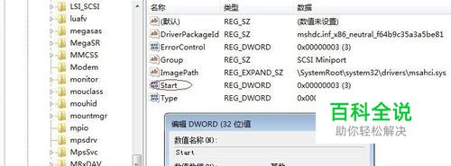 然后依次打开注册表,修改HKEY_LOCAL_MACHINE/System/CurrentControlSet/Services/Msahci下的 start ,把数值数据改为0。