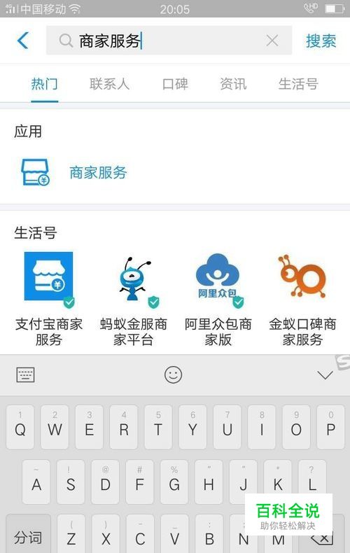 在搜索框内输入“商家服务”,点击后面的“搜索”,搜索出来的第一个应用是,“商家服务”。