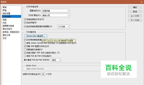 打开文件处理窗口后,下方会有“文件兼容性”的参数设置,其中有个按钮“Camera Raw首选项”,点击打开。