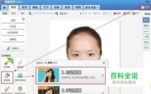 方法二:光影魔术手更换图片背景色 1、打开光影魔术手,点打开按钮,打开一直图片,之后点抠图——自动抠图,如下图:
