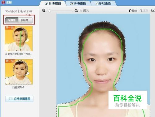 备注:美图秀秀如果版本升级了,那么相应按钮的位置可能改变,不过按钮功能基本不变。 2、点击自动抠图后,打开抠图模式,在人物需要抠图的部分大体画几笔,如下图,如果抠图扣多了,可以点击左侧“删除笔”,在多余的地方画一下就删除多余的部分,确定选取没问题,点击下面的“完成抠图”