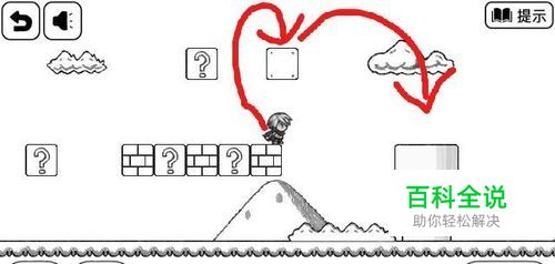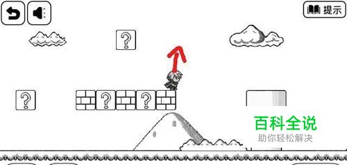 在这里我们可以看到一个问号方块,顶一下,会出现一个有着“温馨提示:请不要掉到河里去。”字体的方块。让后,如图所示,跳到字体方块上面去。