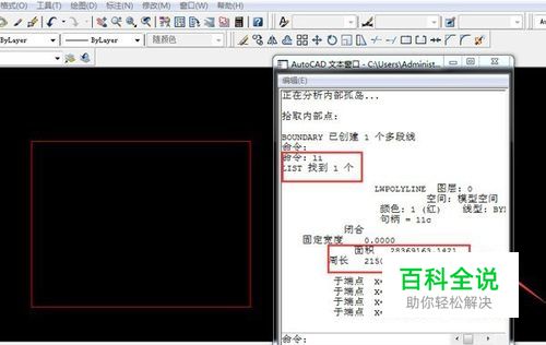 选中范围线(蓝线),输入命令【li】,弹出【编辑】窗口,即得到数据; 面积:18.23平方米;周长21.76米;