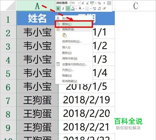 我们 复制A列(姓名)并 粘贴到D列。 复制快捷键:Ctrl+C;粘贴快捷键:Ctrl+V。