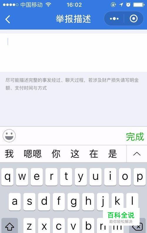 进入选择“举报描述”的界面,在该界面,输入文字部分,尽可能的描述完整事发经聊天过程,涉及到财产损失的药填写明确的金额、支付时间和支付方式;