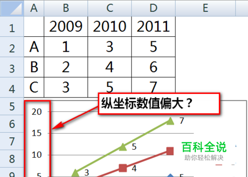 在制作excel图表折线图时,有时会发现纵坐标轴的数值和实际原始数据不一致,纵坐标轴要比实际数值大很多。本例向大家介绍这一现象产生的原因和如何解决这个问题。
